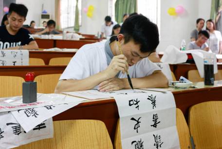 本次比赛两校区共有300多名同学报名参赛,40名选手晋级决赛。决赛分为软笔书法(内容自由发挥)和钢笔书法(内容为“将进酒”),限时三十分钟内完成。决赛选手在纸上泼洒的笔墨犹如他们的青春一般轻舞飞扬,他们对书法的热爱如同钢笔勾画的一勾一点一样坚定不移。黄国强主席和班澜教授均为本次书法大赛决赛题字,并给同学们提出了宝贵的意见。