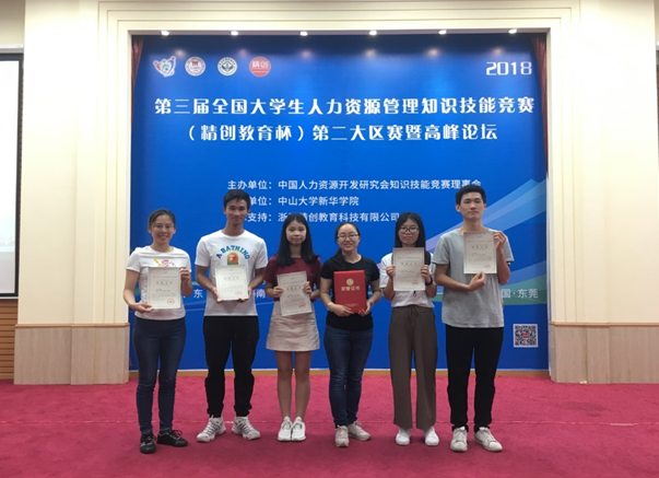 【本网讯】5月12日-13日,为期两天的第三届全国大学生人力资源管理知识技能竞赛(精创教育杯)暨高峰论坛于中山大学新华学院东莞校区举行。由我院工商管理系人力资源管理专业2016级学生林晓聪、陈润泽、马思滢、林秋婷组成的ky开元集团官网代表队荣获赛区一等奖。