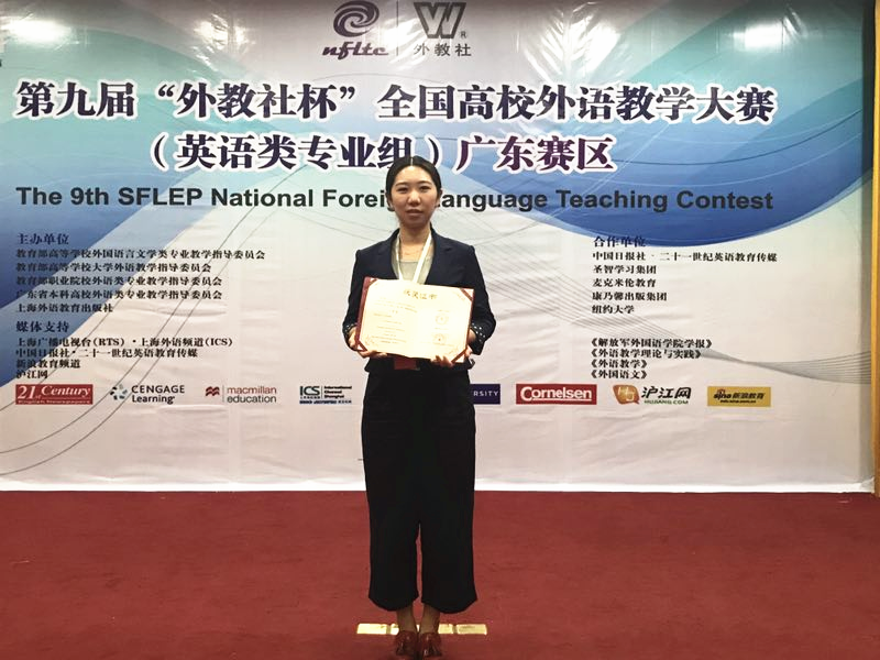【本网讯】10月27日,广东省2018年本科院校外语教学大赛暨第九届“外教社杯”全国高校外语教学大赛(广东赛区)决赛在广州落下帷幕,外语系首次受广东省外语专业教学指导委员会邀请,选派唐婧、陈思云老师参加此次比赛。复赛中,两位老师在全省四十多所本科院校的参赛选手中脱颖而出,双双进入决赛。经过决赛的激烈角逐,唐婧老师获得商务英语专业组“二等奖”,陈思云老师获得英语组“三等奖”。