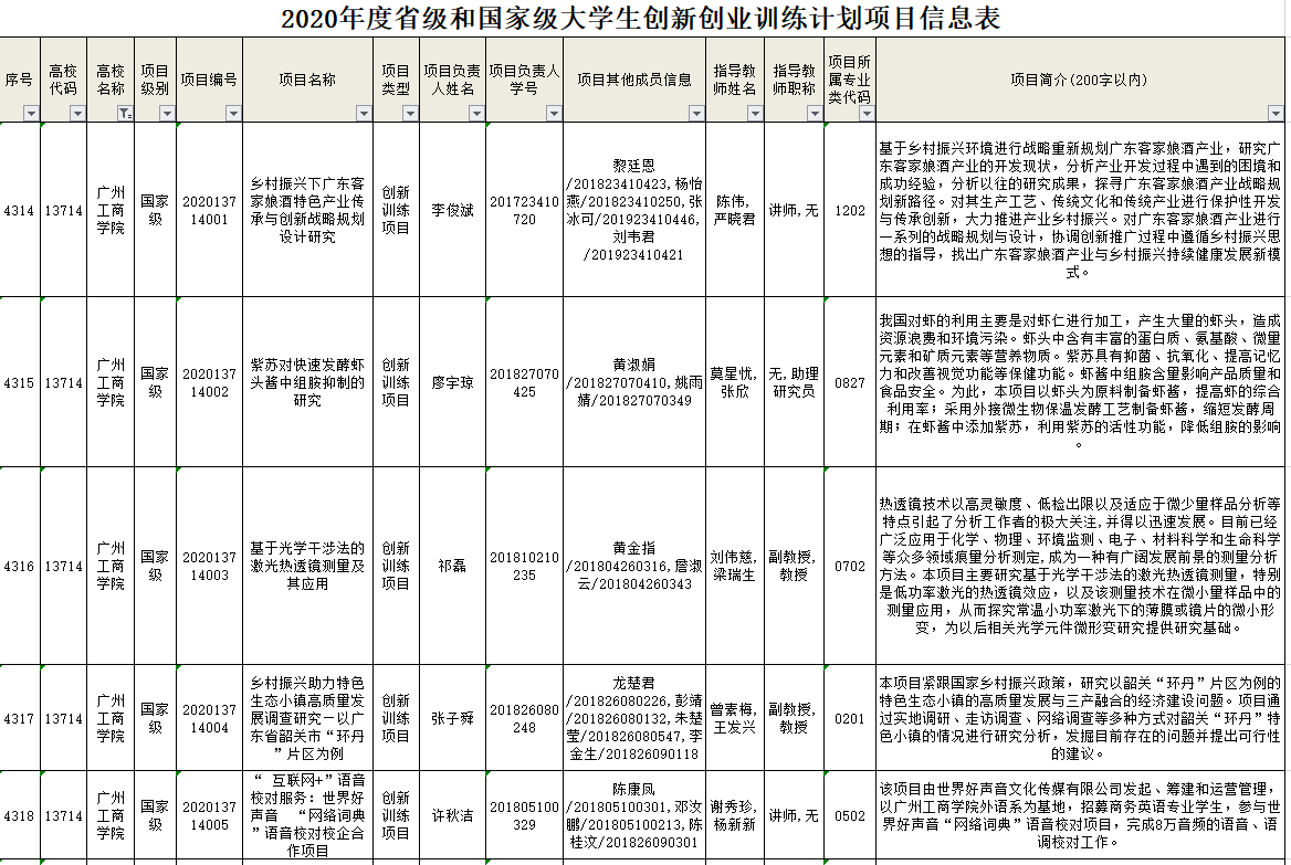 获批的国家级项目如下:《乡村振兴下广东客家娘酒特色产业传承与创新战略规划设计研究》《紫虾苏头对酱快中速组发胺酵抑制的研究》《基于光学干涉法的激光热透镜测量及其应用》《乡村振兴助力特色生态小镇高质量发展调查研究——以广东省韶关市“环丹”片区为例》《互联网+”语音校对服务:世界好声音“网络词典”语音校对校企合作项目》。