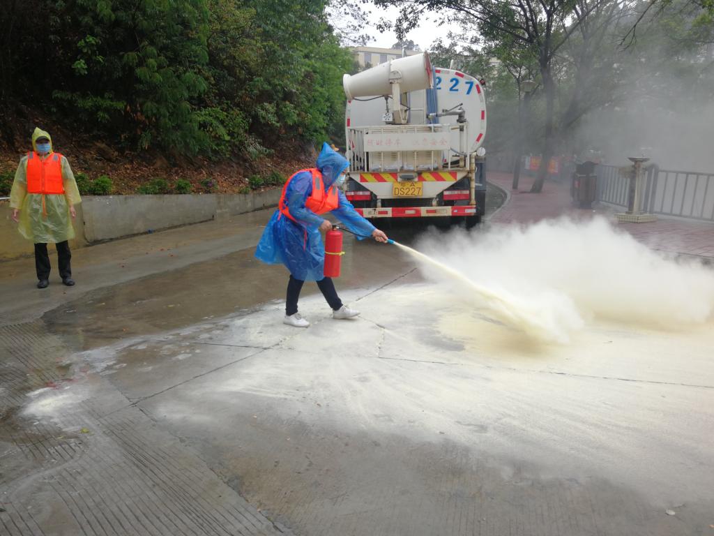 抢险人员轮番上阵,使用灭火器救灾“灭火”。