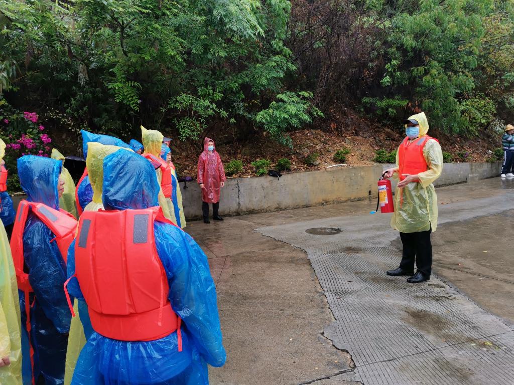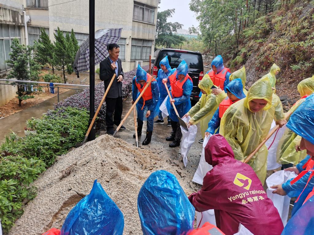 后勤处处长李爱琼、副处长谢爱福、卢文彬、保卫处长林剑平,副处长毛拓艺,及电工、清洁工、保卫队员、宿管等共30多人参加。当天恰逢下雨,为增加真实感,全体人员穿着雨衣、救生衣,严阵以待。