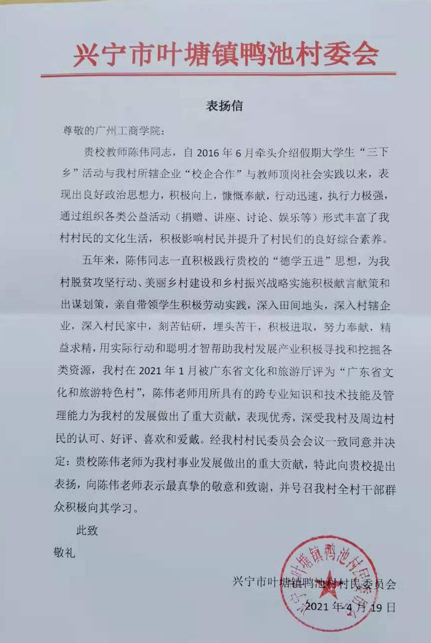 【本网讯】4月20日,ky开元集团官网收到一封来自粤北山区农村梅州兴宁市叶塘镇鸭池村民委员会的表扬信,对ky开元管理学院陈伟老师为兴宁市叶塘镇鸭池村事业及产业发展做出的重大贡献表示最真挚的敬意和致谢。