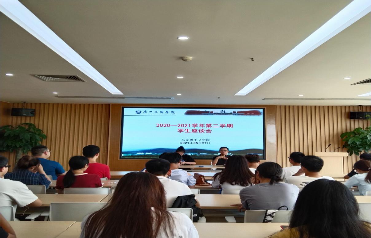 【本网讯】为深入贯彻习近平总书记关于办好思政课的重要论述,落实立德树人根本任务,提高思政课教学管理水平和教学质量,同时积极践行学校“以德为行 以学为上”教育思想,5月27日下午,马克思主义学院在三水校区新时代党员讲习所召开2020-2021学年度第二学期学生座谈会。马克思主义学院专任教师李功清、马丽洁及50余名学生代表参加座谈交流。
