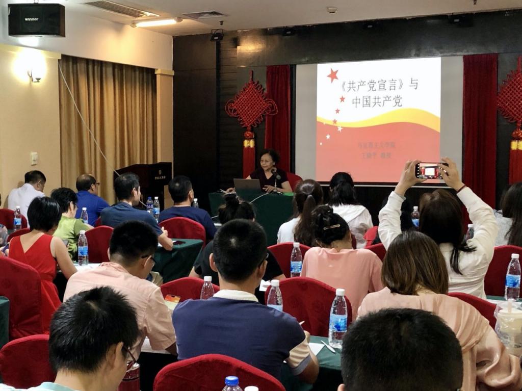 王晓平教授以“《共产党宣言》和中国共产党”为题,总结分享了她的研究体会。她认为,《共产党宣言》是一部具有开创性和奠基性的伟大著作。它适应了无产阶级革命斗争需要,总结了国际工人运动的历史经验,为无产阶级解放事业提供了强大的思想武器;《共产党宣言》体现了科学社会主义形成时期马克思恩格斯科学研究的最高成就,是百年来指导中国共产党的最重要的马克思主义文献,规定了中国共产党的初心和使命的基本内容,为中国共产党保持先进性和纯洁性提供了根本遵循。中国共产党是《共产党宣言》精神的忠诚传人。中国共产党人作为马克思主义的信仰者和实践者,从诞生之时就旗帜鲜明地把社会主义和共产主义定为自己的奋斗目标。