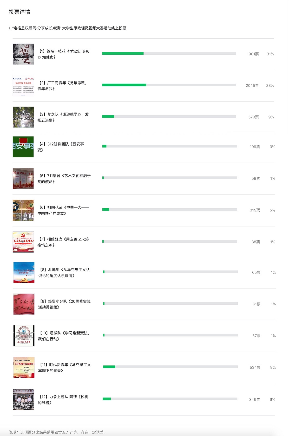 经审查教师团队的初步筛选,共有12份视频类作品进入到线上投票环节。6月5日-6月10日,入围的12份作品在马院微信公众号进行公开线上展示及投票,该投票最终有效填写人次共6198票。