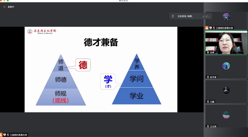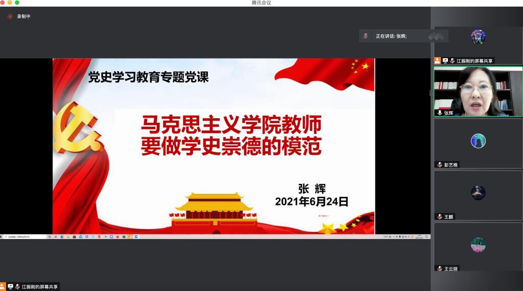 张辉教授分别从“崇尚对党忠诚的大德”、“崇尚造福人民的公德”和“崇尚严于律己的品德”三个方面进行讲授。张辉教授指出:“对党忠诚,是思政课教师首要的政治品质。”她强调,在党史学习教育中要做到学史崇德,就是要求思政课教师崇尚对党忠诚的大德,永远不能忘记入党时所作的对党忠诚、永不叛党的誓言,做到始终忠于党、忠于党的教育事业;要崇尚造福人民的公德,站稳人民立场,始终同人民风雨同舟、生死与共,勇于担当、积极作为,切实把为学生成长成才服好务作为最根本的职责;要崇尚严于律己的品德,慎微慎独,清清白白做人、干干净净做事,德学兼备。她讲述了于漪、卫兴华和高铭暄三位“人民教育家”的先进事迹,希望马院教师以之作为今后工作、学习的榜样。