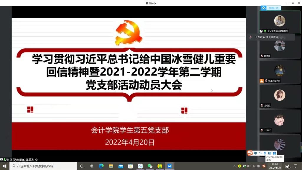 【本网讯】为深入学习贯彻习近平总书记给中国冰雪健儿重要回信精神,激励广大学生弘扬“创新创造、奋勇争先,以实际行动践行“在奋斗中创造精彩人生”。4月20日,会计学院学生第五党支部组织线上学习习近平总书记给中国冰雪健儿重要回信精神。