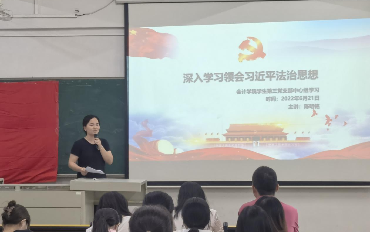 【本网讯】为进一步深学笃用习近平法治思想,切实做到全面系统学、深入思考学、联系实际学。6月21日,会计学院学生第三党支部在第一教学楼开展专题学习会,深入学习领会习近平法治思想。会议由会计学院学生第三党支部组织委员陈明铭同志主持,支部全体党员参会。