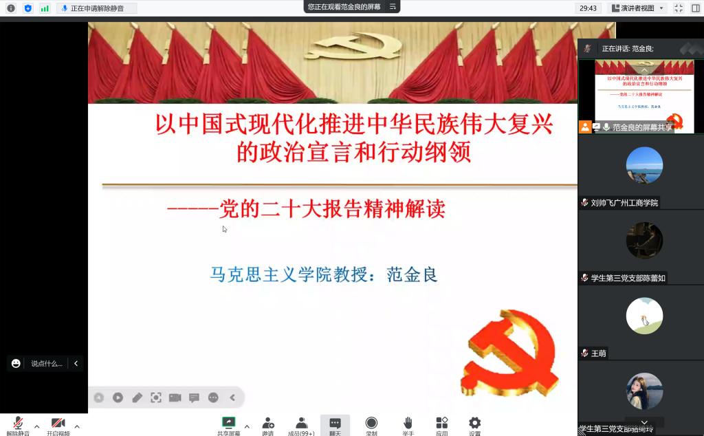 范金良教授以《以中国式现代化推进中华民族伟大复兴的政治宣言和行动纲领》为主题,对党的二十大精神进行解读。范教授指出党的二十大是一次高举旗帜、凝聚力量、团结奋进的大会。党的二十大报告高屋建瓴、博大精深,气势恢宏、催人奋进,是一篇闪耀着真理光芒的马克思主义纲领性文献,是党团结带领全国各族人民夺取新时代中国特色社会主义新胜利的政治宣言和行动纲领。