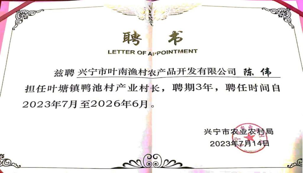 兴宁市农业农村局颁发的县聘产业村长聘书