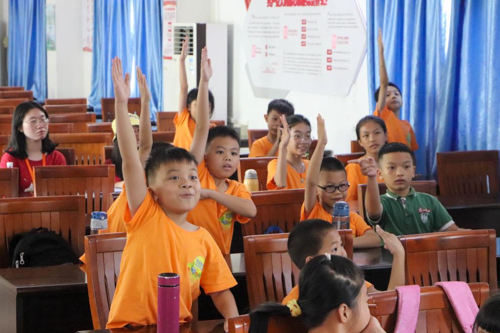 “老师再见”,穿着支教活动统一服装的小朋友隔着马路跟团队成员告别,本次三下乡活动,除了拍摄宣传片,“同心燃梦”志愿服务队还给本地30余名小学生进行了支教。围绕丰富乡村学生暑期生活、启发学生想象,志愿服务团队共设置了科学实验课、剪纸课、粤语儿歌课、暑期安全教育课等十余种课程,鼓励引导学生,寓教于乐。