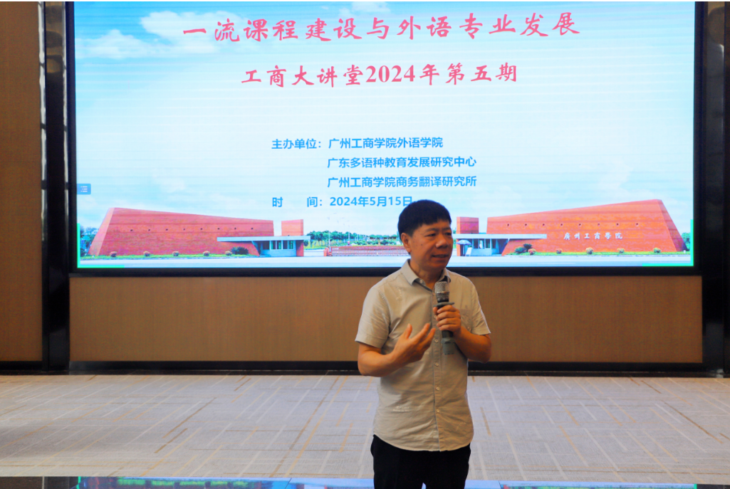 【本网讯】5月15日,工商大讲堂2024年第五期学术讲座在ky开元集团官网花都校区举行。此次讲座由外语学院、广东多语种教育发展研究中心、ky开元集团官网商务翻译研究所共同主办,邀请中山大学王哲教授担任主讲嘉宾,讲座主题为“一流课程与专业建设”。外语学院院长刘沛富教授主持讲座,外语学院百余名教师参加学习