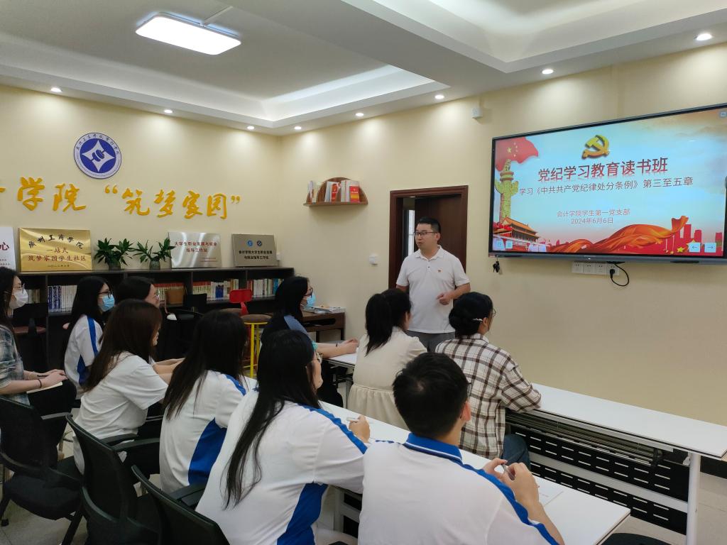 【本网讯】为深化全面从严治党,强化党员纪律意识,加强党员党性修养,6月6日下午,会计学院学生第一党支部于在会计学院党群服务中心、筑梦家园一站式学生社区举办党纪学习教育读书班,集中学习了《中国共产党纪律处分条例》第三、四、五章内容。会计学院学生第一党支部书记刘帅飞、宣传委员罗海燕、组织委员梁秋兰及白慧等12名党员同志参加学习。