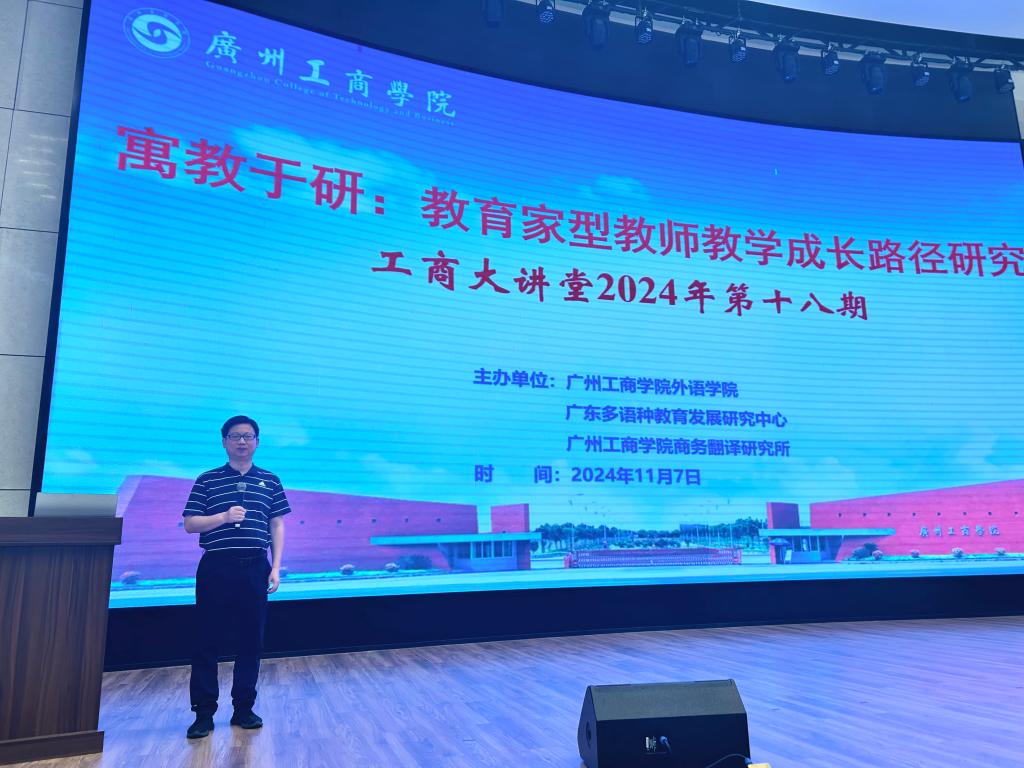 【本网讯】11月7日,学校工商大讲堂2024年第十八期学术讲座在花都校区举行。广东金融学院的许国动博士作为主讲嘉宾,讲座的主题为“寓教于研:教育家型教师教学成长路径探究”。外语学院副院长邢佳平副教授主持,外语学院百余名教师参加。