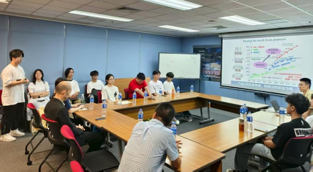 在香港理工大学和华为共建的先进计算系统与网络光互连联合实验室里,同学们领略了高性能计算系统的强大计算能力、高效能网络互连技术以及光纤传感的独特魅力。“相较于以前结构复杂成本高的铜缆,光纤传感能耗降低95%,高速低成本IM/DD是光互联技术的重点发展方向”,师从余长源教授的程博士与大家分享了光纤技术在香港地铁检测等不同领域的应用情况,让同学们了解光纤的优势及光无线通信、光纤传感的潜在价值。