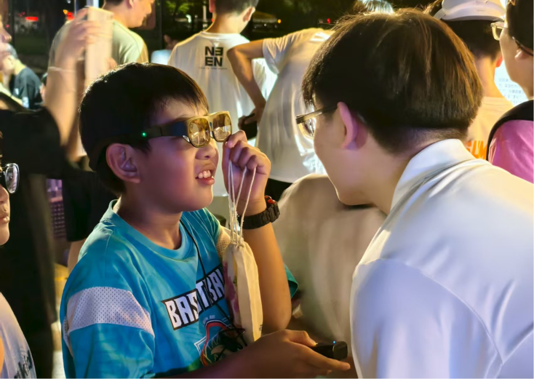 戴上眼镜,仿佛瞬间踏入一个全新的世界——精美的灰塑展厅映入眼帘。同学们不仅熟练地帮助大家佩戴设备,还专业地介绍灰塑项目内容,从灰塑的历史渊源、独特工艺,到如何借助现代科技手段进行数字化保护与传承,让大家深入了解这一非物质文化遗产在科技赋能下的崭新生命力,引得现场体验者连连称赞,排队等候体验的队伍络绎不绝。