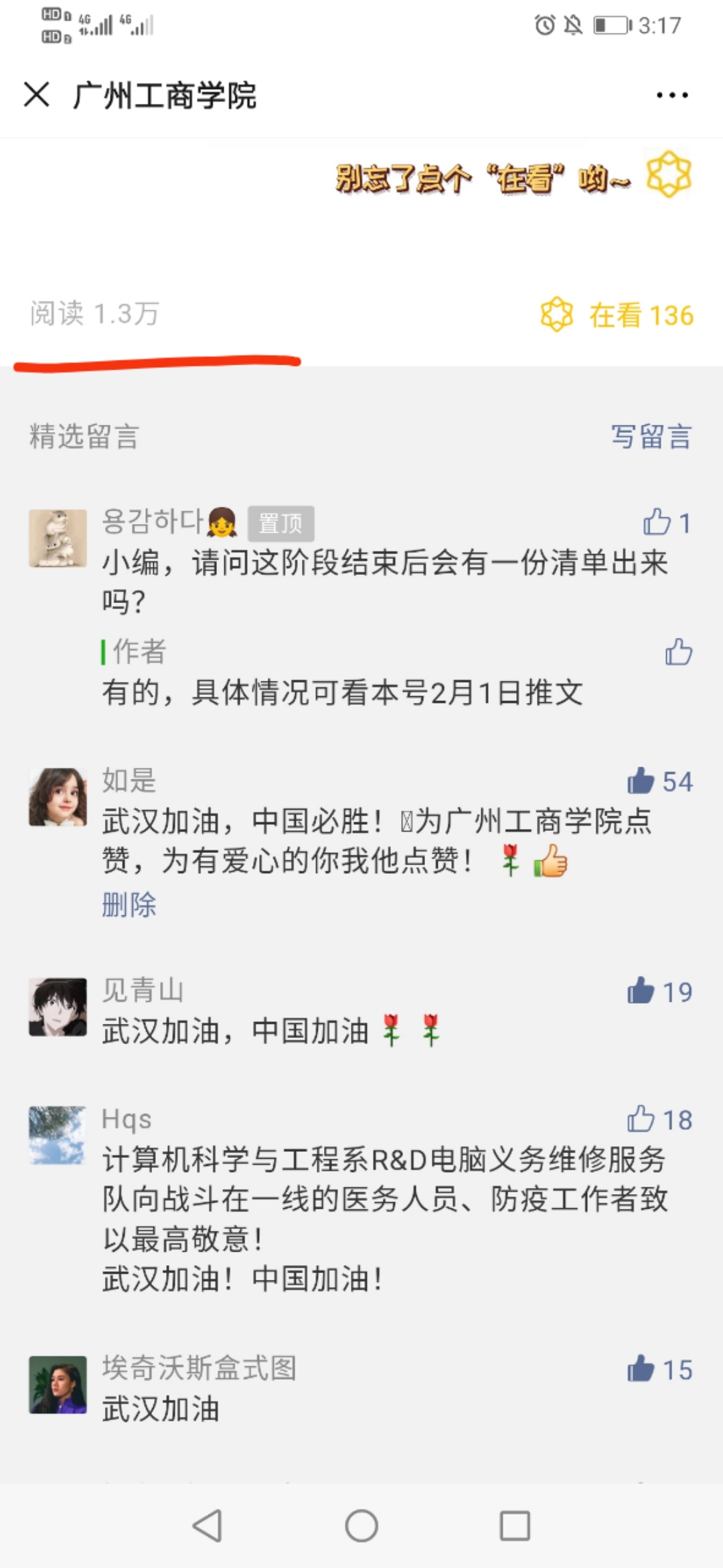 自2020年1月30日22:00学院在官微发出推文后,学院师生员工主动转发,至当晚24:00推文阅读量达5285人,有101个班级群里转发了此消息,同时很多老师纷纷在各类群及各自朋友圈转发,呼吁更多朋友献上一份爱心,24小时募捐27万+,见证广工商的速度与温度,当下,倡议书阅读人数达1.3万+,共有近200个班级在群中转发倡议书,捐款笔数逾2121笔,超33万人民币。