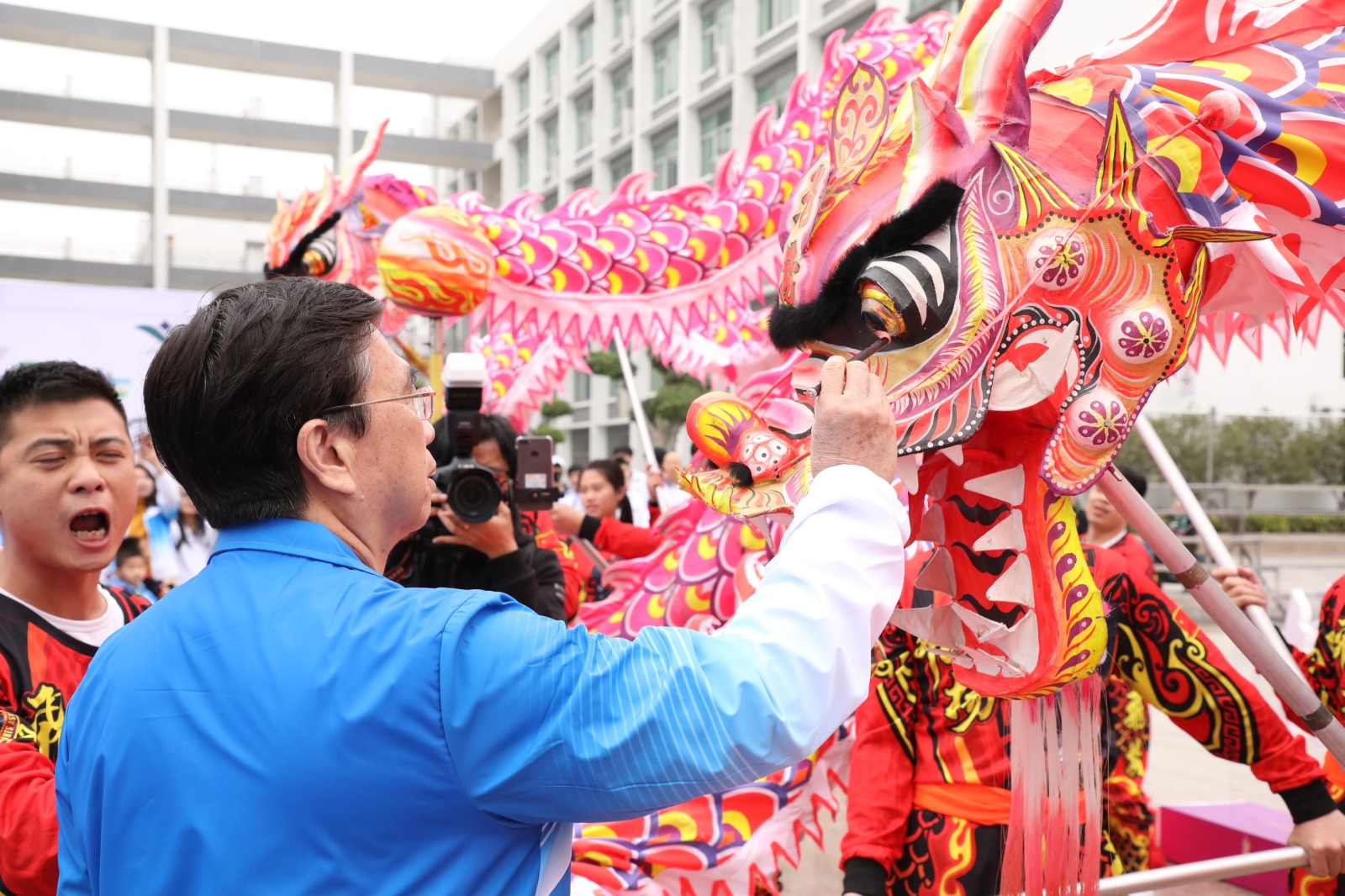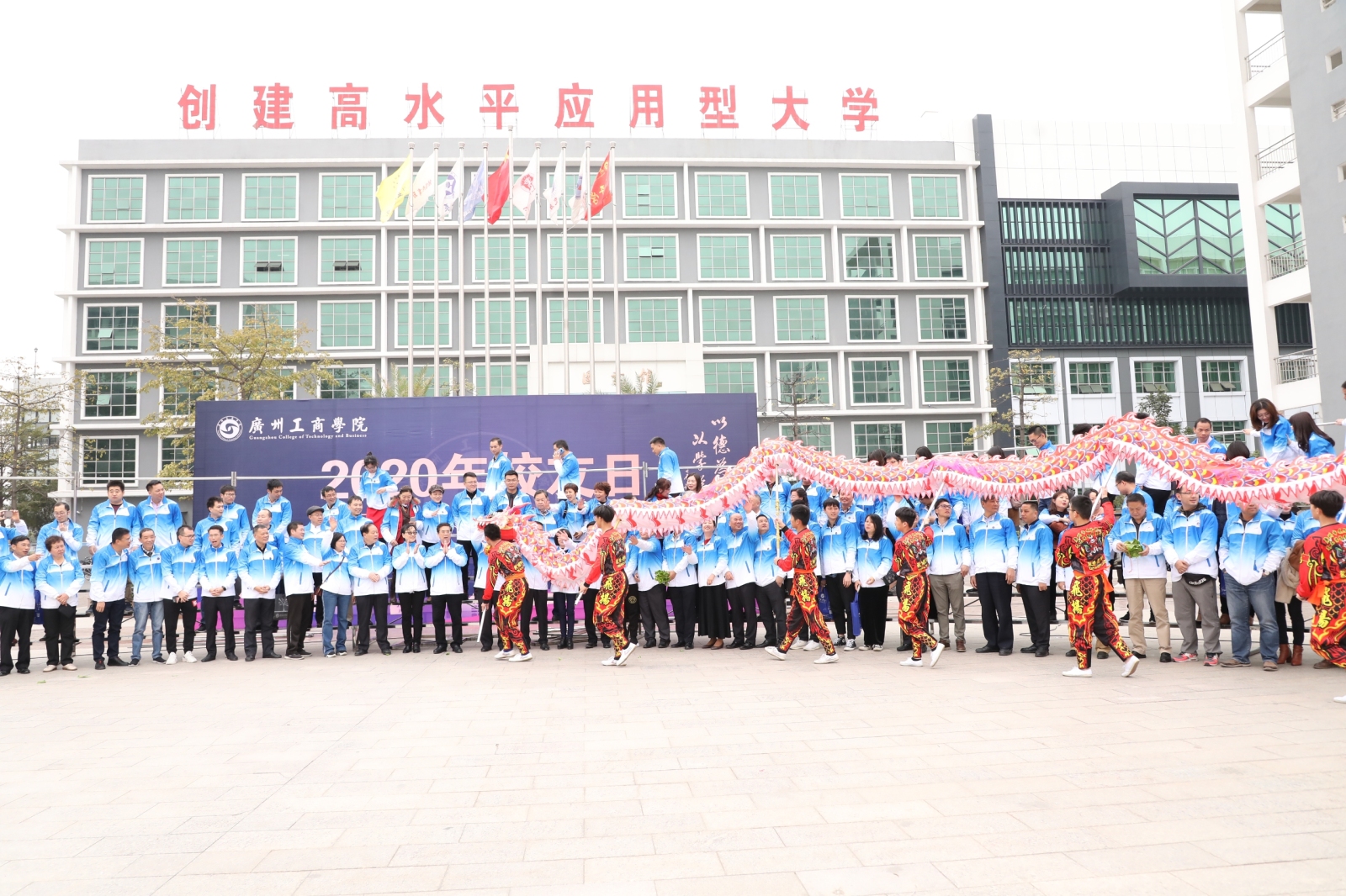 双龙戏珠贺新年,舞龙点睛共团圆。1日1日上午,舞龙点睛仪式在学院三水校区厚德广场举行。伴随着锣鼓声响,两条长约十米的金龙蜿蜒舞动而至,学院院长邝邦洪、党委书记张振超分别手握毛笔,为龙眼点上神采奕奕的一笔。学院领导班子成员、教学单位负责人及职能部门负责人等共同见证了这振奋人心的一幕。仪式结束后,校友们与学院师生们共同合影留念。
