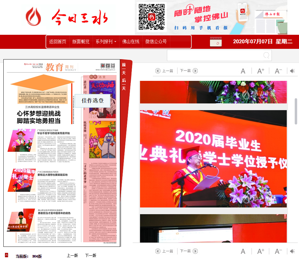 【本网讯】7月6日,学院院长邝邦洪教授的毕业典礼致辞被《佛山日报》的线上APP【佛山+】摘录转载,转载部分如下: