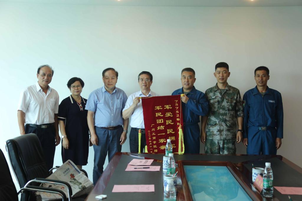 【本网讯】7月21日上午,学院院长邝邦洪教授率队前往75752部队进行“八一”拥军慰问,随行前往的有喻勋良副院长、董事办陆志丹主任和三水校区管委会何国林主任等。75752部队姜军旅长、政治部苏飞副主任、场站姚为东主任等热情迎接。双方进行了友好的座谈。