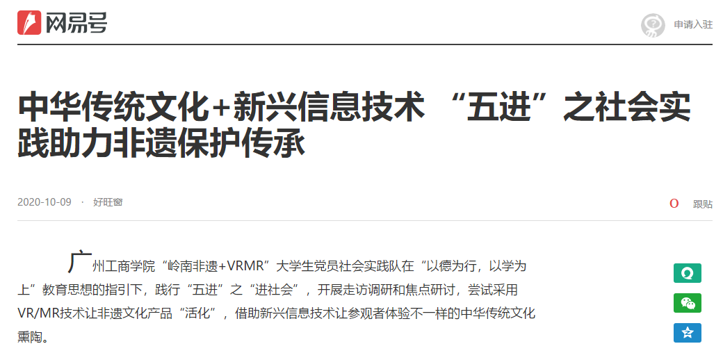 社会实践队师生代表参与了教育部“北创助教”产学研项目《产教融合:MR发展与在高校“德学”教育上应用研究》和中华职教社的《岭南非遗人才培养项目模式创新与实践研究》(ZJS-FY-009)等项目,得到相关专家、老师和VRMR标杆企业上海影创、遂光科技等的大力支持。