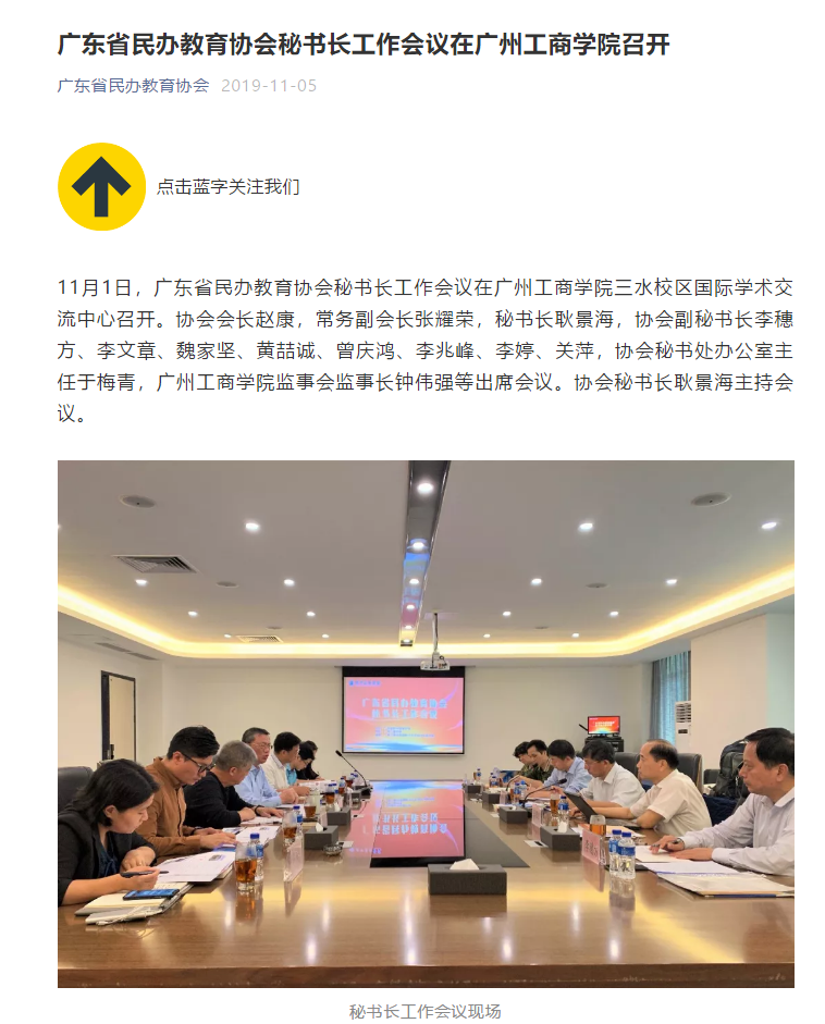 11月1日,广东省民办教育协会秘书长工作会议在ky开元集团官网三水校区国际学术交流中心召开。协会会长赵康,常务副会长张耀荣,秘书长耿景海,协会副秘书长李穗方、李文章、魏家坚、黄喆诚、曾庆鸿、李兆峰、李婷、关萍,协会秘书处办公室主任于梅青,ky开元集团官网监事会监事长钟伟强等出席会议。协会秘书长耿景海主持会议。