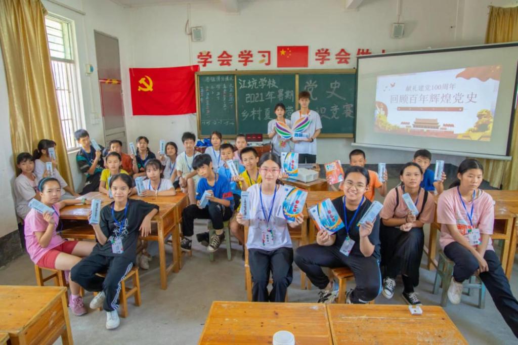 2021年7月19日至7月29日,学校青萌公益江坑实践团以“党建引领振兴路,美丽江坑谱新篇”为主题,围绕“我为青少年讲党史”的主线,为江坑村的80余名青少年开展“趣学党史”等课程,引领青少年学党史、讲党史,听党话、跟党走,培养他们对党和社会主义祖国的朴素感情。师生们用青少年易于接受的语言和形式,解答中国近现代史和中国共产党党史方面的重点、热点问题,同时采用党史知识竞赛、红色歌曲竞唱、红色影片展播等,构建了适合青少年的党史学习教育新形式。驻村支教期间,青萌还继续深化结对帮扶机制,与多位在学业上需要帮扶的学生确认了结对关系;拜访慰问村中“光荣在党50年”的老党员,学习他们身上最纯粹的党性,继承红色基因、革命薪火,做信仰坚定的追梦人。