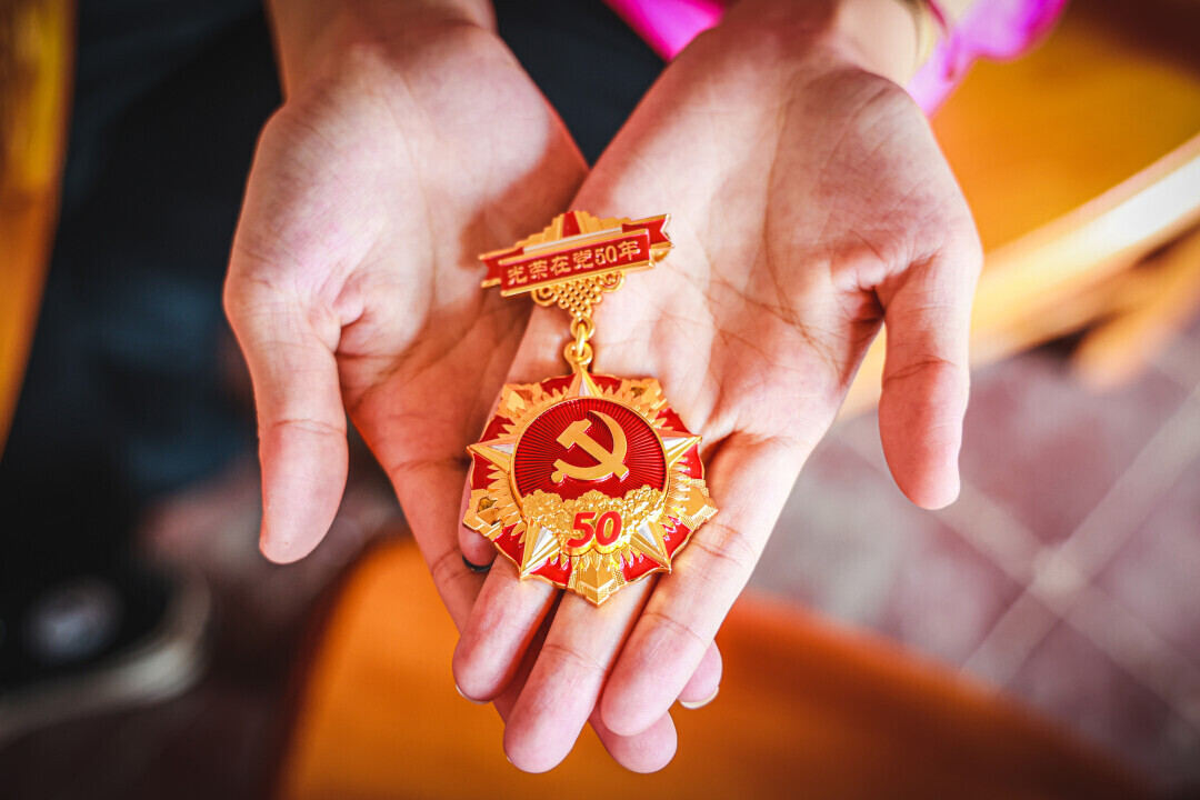 图为刘罗苟同志手拿“光荣在党五十年”纪念章。中国青年网通讯员 刘锡泉 摄