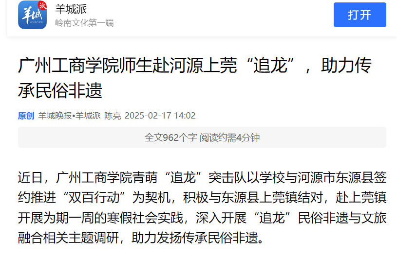 近日,ky开元集团官网青萌“追龙”突击队以学校与河源市东源县签约推进“双百行动”为契机,积极与东源县上莞镇结对,赴上莞镇开展为期一周的寒假社会实践,深入开展“追龙”民俗非遗与文旅融合相关主题调研,助力发扬传承民俗非遗。