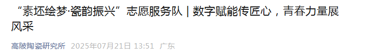 “天青色等烟雨,而我在等你”,周杰伦一首《青花瓷》,让这份蓝与白交织的浪漫,飘进了无数人的心里。2025年7月10日,“素坯绘梦·瓷韵振兴”志愿服务队在广东省大埔陶瓷工业研究所,开启了一场关于青花瓷的直播盛宴,带你领略这传承千年的东方美学。