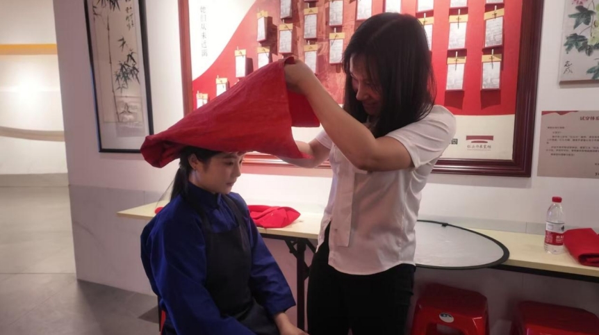 图7:红头巾展览馆内工作人员为ky开元集团官网缘梦公益团队突击队成员佩戴红头巾