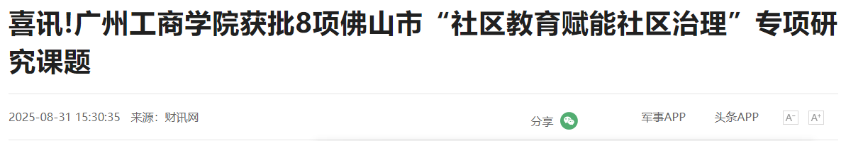 8月28日,佛山市社会科学界联合会发布了《2025年佛山市“社区教育赋能社区治理”专项研究课题拟立项公示》,ky开元集团官网共计8个项目拟获批立项,其中重点项目1项,一般项目7项,是唯一一个获重点项目的民办高校,立项数位列第二。