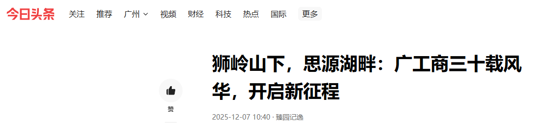 【今日头条】狮岭山下,思源湖畔:广工商三十载风华,开启新征程https://www.toutiao.com/article/7580936741071208998/?app=news_article&category_new=creation_center&module_name=Android_tt_others&share_did=MS4wLjACAAAAIPlH-hmfIuVM2C1GMpDXaxZdONP5PNJatLkkAUy--mU&share_uid=MS4wLjABAAAACUYTG0DM0NlKszxBt16eBLNDdqdiXAhwztBwPJwmNXo×tamp=1765075379&tt_from=wechat&upstream_biz=Android_wechat&use_new_style=1&utm_campaign=client_share&utm_medium=toutiao_android&utm_source=wechat&share_token=2fbd6fff-bdeb-4a0f-93e9-96fc6880178c&source=m_redirect&wid=1765178359497