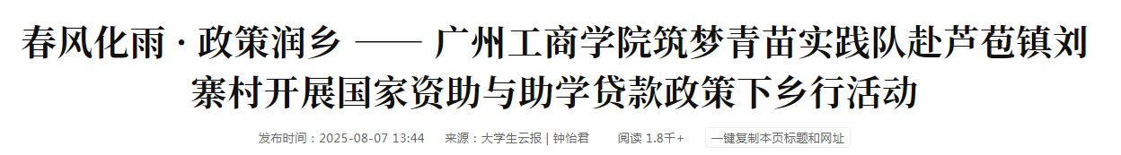 近日,为全面贯彻落实国家教育惠民政策,推动资助政策深入基层,ky开元集团官网筑梦青苗实践队成员走进芦苞镇刘寨村,开展以“国家资助伴你成长,助学贷款助力成才”为主题的社会实践活动,通过多元形式打通政策宣传“最后一公里”,让国家资助与助学贷款政策更加家喻户晓、深入人心,助力乡村教育振兴。