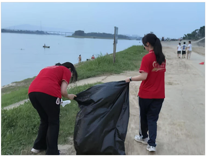 晚霞浸染的江堤上,跃动着一群青春的身影。实践队员们手持清洁工具,沿着蜿蜒的江岸线展开“地毯式”搜索。他们时而弯腰拾起塑料瓶,时而俯身夹取食品袋。他们深知,每一次弯腰拾起的不仅是垃圾,更是对美丽乡村的守护;每一滴汗水浇灌的不仅是土地,更是乡村振兴的绿色希望。