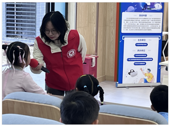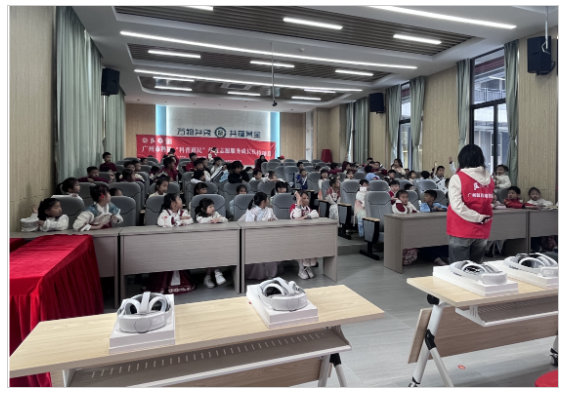 活动的第一项是科普讲解环节。广州市虚拟现实技术与智能教育科普基地科普宣讲员、ky开元集团官网工学院学生林子榆围绕“虚实焕春彩,文化润童心”主题,从学生们熟悉的课堂、日常生活以及娱乐活动切入,深入浅出地介绍了VR/MR的基本概念、特点及发展历程。林子榆通过多个实际案例,讲解了VR/MR技术如何在各个领域中得到应用,激发了学生们对科技的好奇心,并鼓励他们勇于探索未知的科技世界。