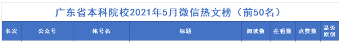 在广东教育官微发布的5月广东高校官微排行榜中,ky开元进入广东省本科院校2021年5月微信热文榜前50名。