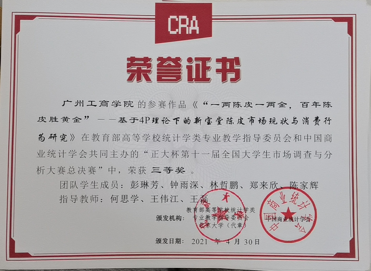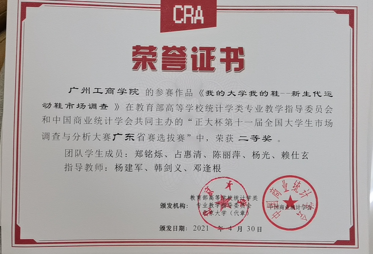 全国大学生市场调查与分析大赛是由中华人民共和国教育部主管,教育部高等学校统计类专业教学指导委员会和中国商业统计学会主办的学科竞赛。赛事一直致力于提高大学生的数据调查实施和数据处理与分析等实战能力,培养学生的市场敏锐度、团队协作能力和社会责任感,此次获奖体现了学校注重应用型人才的培养及学生实践能力的提升。(管理学院)