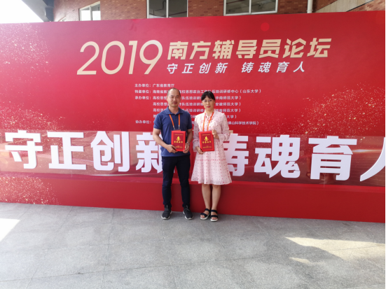 【本网讯】近日,由广东省教育厅主办的2019年南方辅导员论坛在华南农业大学丁颖礼堂召开。论坛主题为“守正创新,铸魂育人”,教育部思政司、广东省教育厅、海南省教育厅相关领导出席,我院党委副书记、学生处处长黄鹏和获奖辅导员王伟江、蒙宗玲、谢和成参加了此次论坛。在2018年度广东高校辅导员年度人物评选活动中,王伟江获“最具科学精神辅导员”称号,蒙宗玲和谢和成荣获“2018 年广东高校辅导员年度人物”入围奖 。