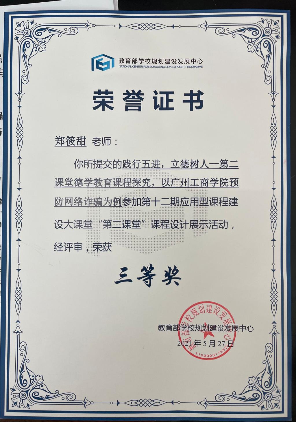 在第十二期应用型课程大课堂“第二课堂”说课展示中,ky开元辅导员郑筱甜老师以ky开元集团官网预防网络诈骗为例展示的《践行五进立德树人——第二课堂德学教育课程探究》获得全国赛三等奖。据了解,本次比赛一等奖空缺。