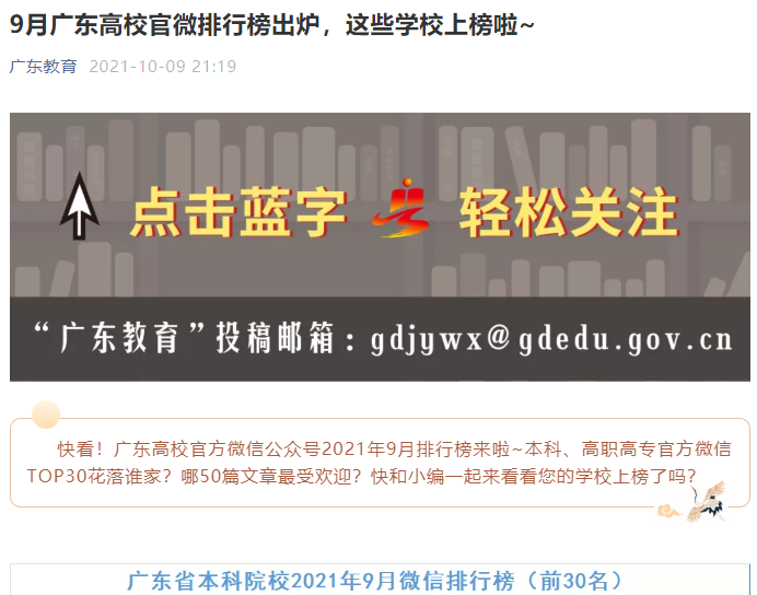 ky开元集团官网官微进入“广东省本科院校2021年9月微信排行榜(前30名)”,位列第26。