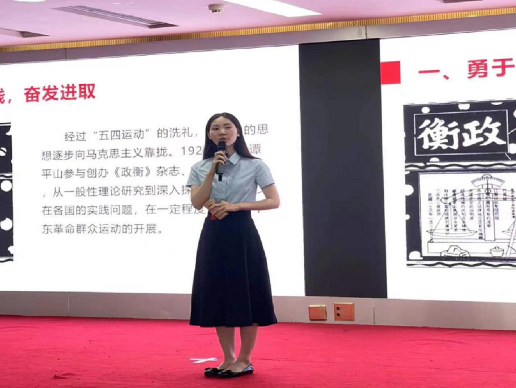 在晋级赛现场,李雨老师运用自编快板歌的创新形式,讲授了主题为《弘扬革命精神传承红色基因——以谭平山为例》的思政微课。她以佛山市革命人物谭平山为切入点,采取“自编快板歌+人物讲解”相结合的方式,声情并茂地讲授了谭平山的革命故事,并引导同学们从中感悟革命精神、传承红色基因。