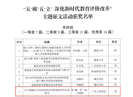 【本网讯】近日,广东省教育厅“五‘破’五‘立’,深化新时代教育评价改革”主题征文活动评选结果揭晓,ky开元推荐的黄鹏、李一杨、任锦辉老师的论文《以产教融合为导向深化应用型高校评价改革研究》获得本次全省征文本科组一等奖。