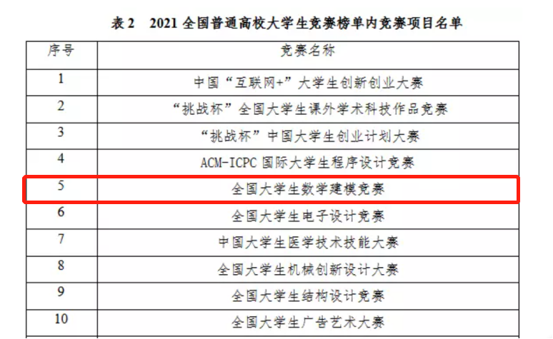 2022年2月22日,中国高等教育学会高校竞赛评估与管理体系研究工作组发布2021全国普通高校大学生竞赛排行榜。进入2017-2021年学科竞赛排行榜榜单的一共有56项竞赛,全国大学生数学建模竞赛位列第五。这56项竞赛,是教育部官方认可的,最具含金量、最具参赛价值的赛事。