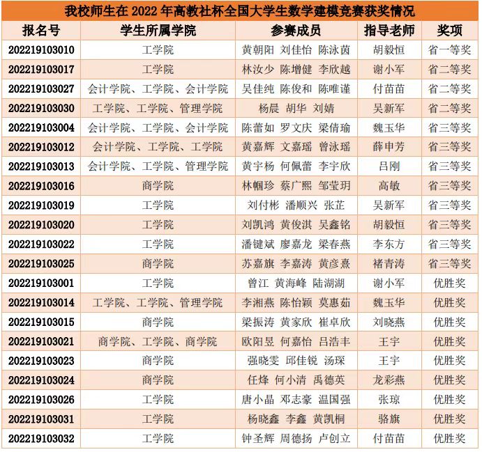 【本网讯】近日,2022年高教社杯全国大学生数学建模竞赛广东赛区获奖名单公布。ky开元通识教育学院胡毅恒、谢小军、付苗苗、吴新军老师等数学建模教师团队积极带领学生参赛,经过激烈比拼,ky开元师生队伍获得省一等奖1项、省二等奖3项、省三等奖8项、优胜奖9项,取得历史性突破。