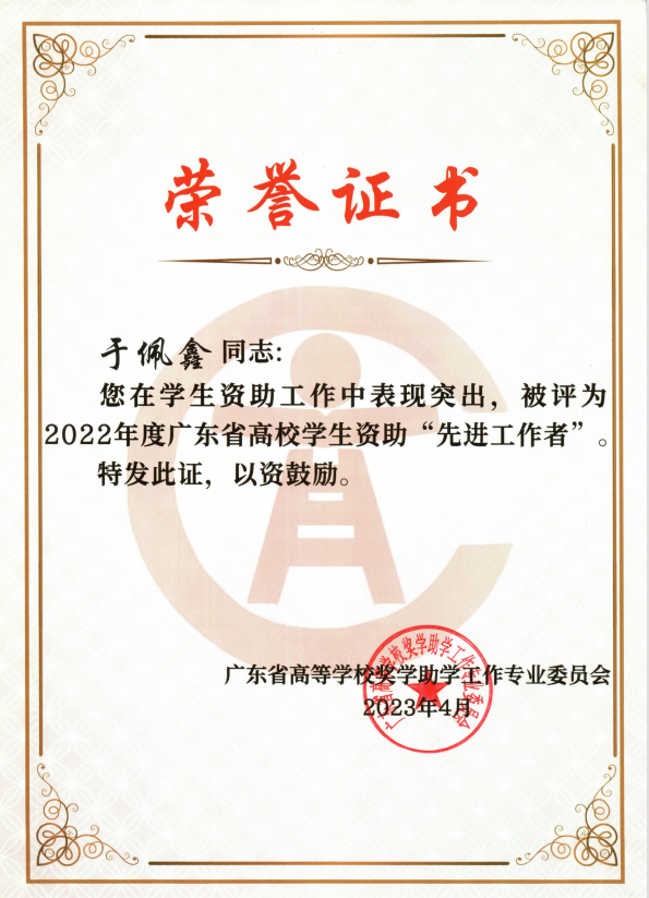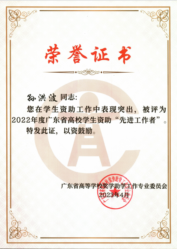 【本网讯】近日,广东省高等学校奖学助学工作专业委员会下发了《关于表彰2022年度广东省高校学生资助先进工作者的通知》(粤奖助委〔2023〕2号),ky开元孙洪波、于佩鑫两位老师被评为2022年度广东省高校学生资助先进工作者。