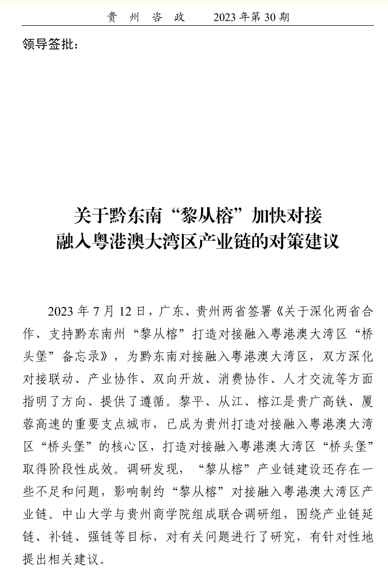 【本网讯】近日,由乔鹏亮、梁永堂等教师联合撰写的咨询报告《关于黔东南“黎从榕”加快对接融入粤港澳大湾区产业链的对策建议》,成功获得了贵州省副省长的签批,被期刊《贵州咨政》采纳,并报贵州省省委、省人大、省政府、省政协领导,送省发改委、省商务厅、省住建厅、黔东南州委州政府。