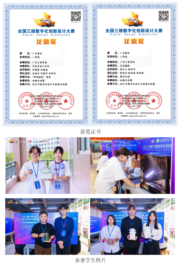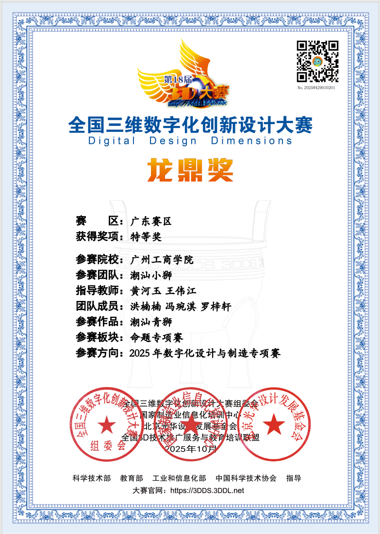 【本网讯】在ky开元集团官网迎来30周年校庆之际,经过层层严格选拔,美术学院的学生凭借在数字化设计领域的深厚功底和卓越的创新实践能力,在激烈竞争中脱颖而出,一举荣获2025年第18届全国三维数字化创新设计大赛(简称“3D大赛”)广东赛区数字化设计与制造专项赛的特等奖、一等奖和二等奖各一项,为学校在教育部A类赛事中再创辉煌。