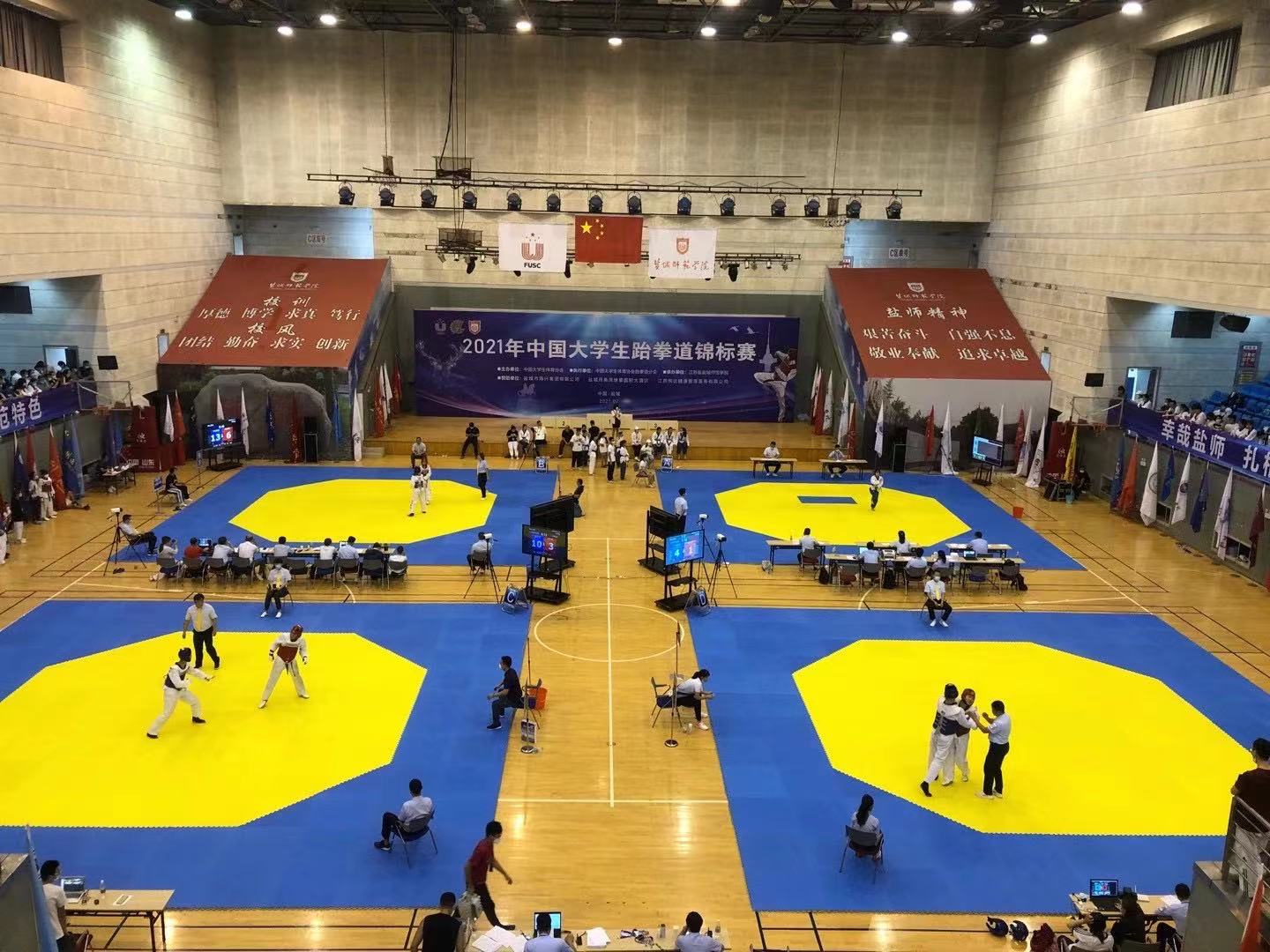 【本网讯】2021年中国大学生跆拳道锦标赛于7月21-25日在盐城师范学院体育馆举行,共有来自全国138所高校的1100余名学生运动员参赛。比赛分为甲组(本科)、乙组(体育专业)、丙组(高水平运动队),共设竞技、品势和跆拳道舞三大比赛项目。甲组共开设14个级别的竞技比赛项目和品势比赛。